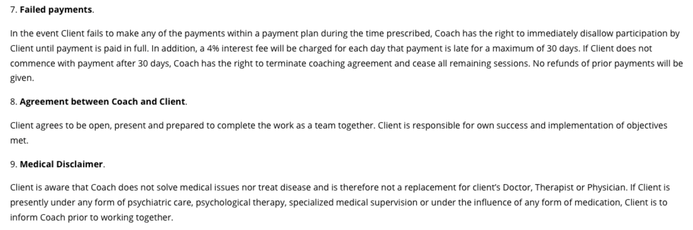 Client agrees that the Coach will not be held liable for any damages of any kind resulting from including but not limited to; direct, indirect, incidental, special, negligent, consequential or exemplary damages happening from the use or misuse of the Service. Client agrees that use of this service is at user's own risk.